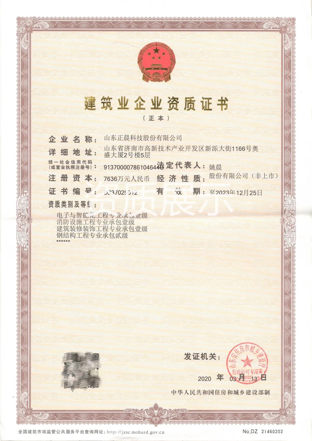 截止目前,正晨公司已拥有建筑工程施工总承包、电力工程施工总承包、市政工程施工总承包、机电工程施工总承包以及建筑智能化、消防、装饰装修、机电安装、城市道路照明、钢结构工程施工专业承包等三十余项资质,促进了工程总承包与专业承包格局的持续优化与改善,为企业长远发展打下了坚实基础。