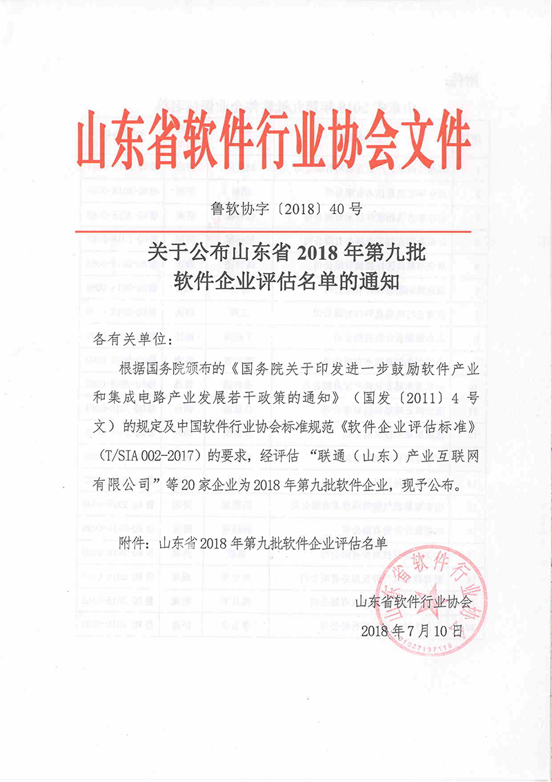 近期,根据国务院颁布的《国务院关于印发进一步鼓励软件产业和集成电路产业发展若干政策的通知》的规定及中国软件行业协会标准规范《软件企业评估标准》的要求,经过山东省软件协会的严格审查,星空官方网页版通过了软件企业认定的严格评审程序,被授予山东省2018年第九批软件企业。
