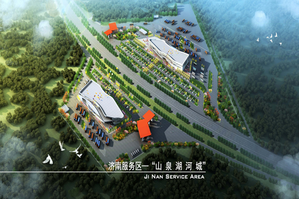 济南服务区位于济南高新区东北部,毗邻东巨野河,地理位置优越,自然景观优美。总体布局采用以服务区综合体和休闲场地为中心的中置式布置,人车分流,客货分离,功能分区主从分布明确,动线简捷通畅,景观环境重点打造,最大限度的体现“以人为本”的服务设计理念。共设有396个停车位。项目建设中,坚持创新驱动发展,积极推广应用新工艺、新材料,全力打造优质舒适、智慧高效的品质示范工程。